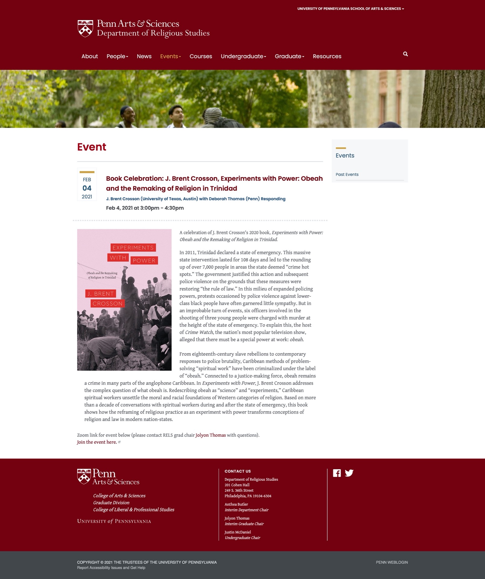 University of Toronto's Entangled Worlds: Sovereignty, Sanctities and Soil Meet the Authors series will feature J. Brent Crosson's Experiments with Power on March 24th, 2021.