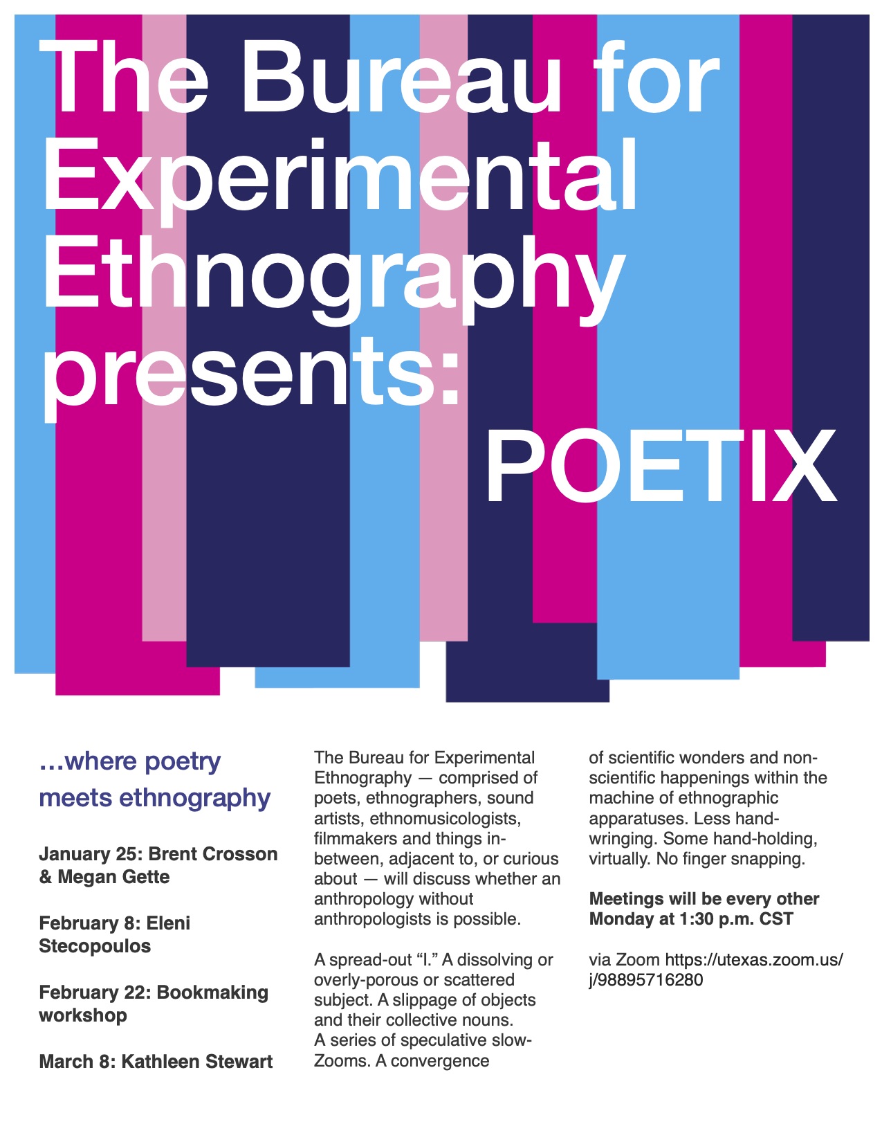 With Megan Gette, I will curate a series of events at UT Austin's Bureau of Experimental Ethnography (BEE) on poetry, sound, and experimental ethnography. Details forthcoming. Spring semester 2021.